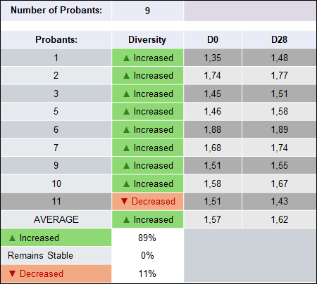 The paired changes reveal that 89% of subjects (8 out of 9) demonstrated an increase in microbial diversity, 0% remained stable, 11% (1 out of 9) showed a decrease. The distribution of values is illustrated in the corresponding boxplot, (Figure 1) which shows a shift of the central tendency upward and a slight narrowing of the interquartile range at D28. This pattern is consistent with a general improvement in oral microbiome diversity with limited variability among subjects.