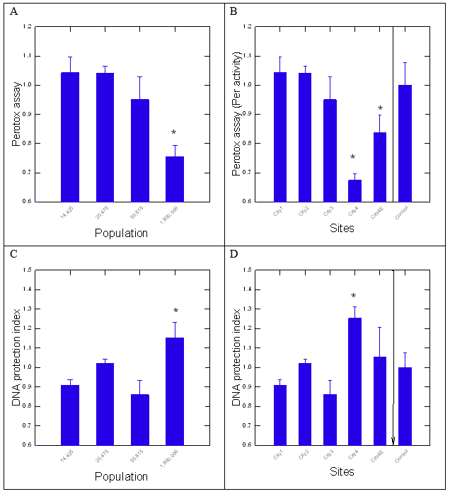 The quality of the surface water extracts was examined by biomolecular and enzyme-based assays. For the pyr-glyox assay, the formation of malate was significantly lower at the most populated city (City 4) and its municipal dispersion plume (City 4E) suggesting degraded water quality (Figure 1A and 1B). Malate production was also significantly dampened at City 3 compared to control blanks (ethanol). Correlation analysis revealed that population size was the main driver of changes; population was correlated with malate levels (r=-0.84 and to Perotox assay at r=-0.67), PsNPs (r=-0.62), humic/fulvic acid (r=0.54) and Chla (r=-0.7). This suggests that highly populated cities inhibit more strongly malate levels and contain more Chla with lower humic/fulvic acid and PSNPs. Indeed, PSNPs was rather associate to lower population size and did not significantly contribute to lower water quality at the most populated city 4. Hence, water quality decreases at a threshold population of 300 600 inhabitants (geometric mean of city 4 and city 3 = [1800000 x 50815] ½). Water quality was further examined by the Perotox assay and revealed similar findings. The assay determines peroxidase inhibitions by the surface water extracts without and with added DNA. Peroxidase activity was significantly inhibited by the surface waters from the most populated city and its municipal dispersion plume (city 4E), in concordance with the pyr-glyox pathway assay (Figure 2A and 2B). The levels of intermediate III of peroxidase, representing a non-catalytic state for removing H2O2, did not significantly change with(out) the addition of DNA (results not shown). Correlation analysis revealed that the Perotox assay was correlated with the pyr-glyox assay (r=0.5), population size (r=-0.67) and PSNPs (r=0.74). Again, this suggest that PSNPs contribute less to water quality as defined by both the pyr-glyox and Perotox assays. A variation of the Perotox assay consists of pre-incubation of a fixed quantity of DNA with the extract to seek out whether peroxidase inhibitions could be prevented by DNA. The DNA protection index-DNAi (ratio of peroxidase activity with(out) added DNA) was significantly higher for surface waters collected at the most populated city (Figure 2C). The DNAi was significantly higher at the most populated city but not in the municipal dispersion plume indicating reduced output of genotoxic compounds. This suggests that genotoxic compounds are released by a population threshold of 300600 inhabitants in the Saint-Lawrence river. The DNAi was significantly correlated with population (r=0.56), PSNPs (r=-0.73), humic/fulvic acid (r=0.52), pyr-glyox (r=-0.48) and Perotox (r=-0.77) assays.