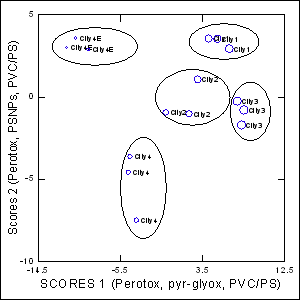 Discriminant was determined with the various parameters to determine similarities between sites (cities) and determine the most important descriptors allowing site discrimination. The analysis revealed that the total variance was explained at 97%, all cities including the municipal effluent plume were completely discriminated and the most important properties are listed on the abscissa and ordinate scales: Perotox, pyr-glyox, PVC/PS and PSNPs.