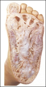 The plantar fascia is a thick, multilayered and inelastic band of fibrous tissue that extends along the plantar surface of the foot (Jeswani et al., 2009). Plantar fascia includes of collagen and elastic fibers. Elastic fibers are shaped as strands and networks with different thicknesses. The elastic fibers in compare with the collagen fibers have lower modulus of elasticity. Plantar fascia is composed of densely compacted collagen fibers that most of them are originated longitudinally and some of them are directed transversely and obliquely (La Porta & La Fata, 2005). Plantar fascia originates from the medial process of the calcaneal tuberosity (Wearing et al. 2006) and proximal to the origin of the flexor digitorum brevis (La Porta & La Fata, 2005). The medial band of the plantar fascia is thin and non-existent at its proximal level; on the contrary, the lateral band is thick and developed but it is completely absent in 12% of people. The central aponeurotic band is the major component of the plantar fascia both structurally and functionally. Its origin is independent of the tendo-achilles in adults. At the level of mid-tarsal, central band is divided into five branches and proximal to the metatarsal heads, each of them is divided into superficial and deep tracts (Wearing et al., 2006). The medial and the lateral bands cover the intrinsic musculature of hallux and fifth digit. The central band is the most tensile band and overlies the short and long digital musculature. There are longitudinal vertical fibers between the medial and central and between the central and lateral bands that form the intermuscular septa; besides, the branches of plantar vessels and nerves are sent to the sole of the foot through them (La Porta & La Fata, 2005).