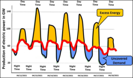 The red curve in Figure 1 describes the future total electricity consumption of industry and households in gigawatts (Bundesnetzagentur, (n.d)), while the black curve represents the sum of wind energy and wind power generation. These curves are generated from the real data of the week from April 12th to 18th in 2021 and the black curve was multiplied by a factor of approximately 4. This corresponds approximately to the expansion target for all of Germany. The yellow areas indicate daytime surpluses, the blue areas night time deficits.