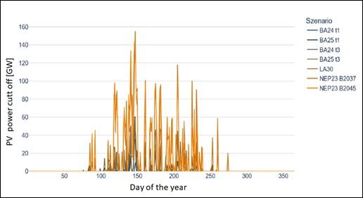 Figure 2: Scenarios of PV curtailments over the course of a year with insufficient storage capacity (Bewertung Systemstabilitätsbericht Bundesnetzagentur, 2025).