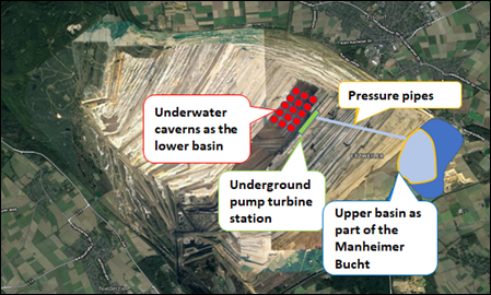 This article describes a new approach that proposes using existing, old open-cast lignite mines as sites for new pumped storage power plants. In the Renish mining district – a region between Cologne, Erkelenz, and Aachen – three large open-cast lignite mines are currently in operation, but these will be decommissioned in the coming years. The open-cast lignite mines reach depths of between 200 and 400 meters, thus offering ideal conditions for pumped-storage power plants. The Hambach mine, in particular, with its 400-meter depth, is exceptionally well-suited for such an unconventional pumped-storage power plant. A key feature is the separation of the water volume between the upper and lower storage basins from the residual water in the retention basins. The lower storage basin can be constructed in large, reinforced concrete caverns with a diameter of over 60 meters. The upper storage basin is located near the former ground level. The Hambach site allows for the installation of a capacity exceeding 6 GW and a storage capacity of over 50 GWh, which would surpass the maximum output of the largest pumped-storage power plant in Germany by at least five times. This Hambach pumped-storage power plant could cover a large portion of Germany’s total storage demand during the day-night cycle.