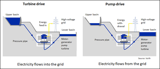 Figure 3: Operating principle of a pumped-storage power plant (Source Voith Hydro (Voith (n.d)).